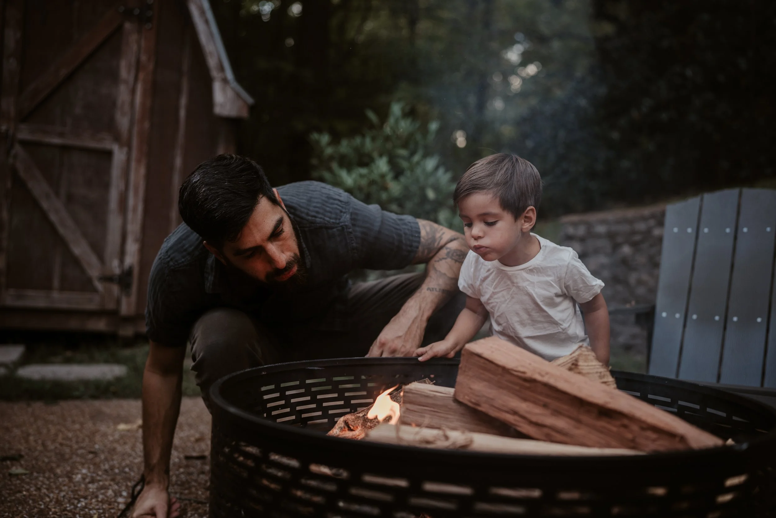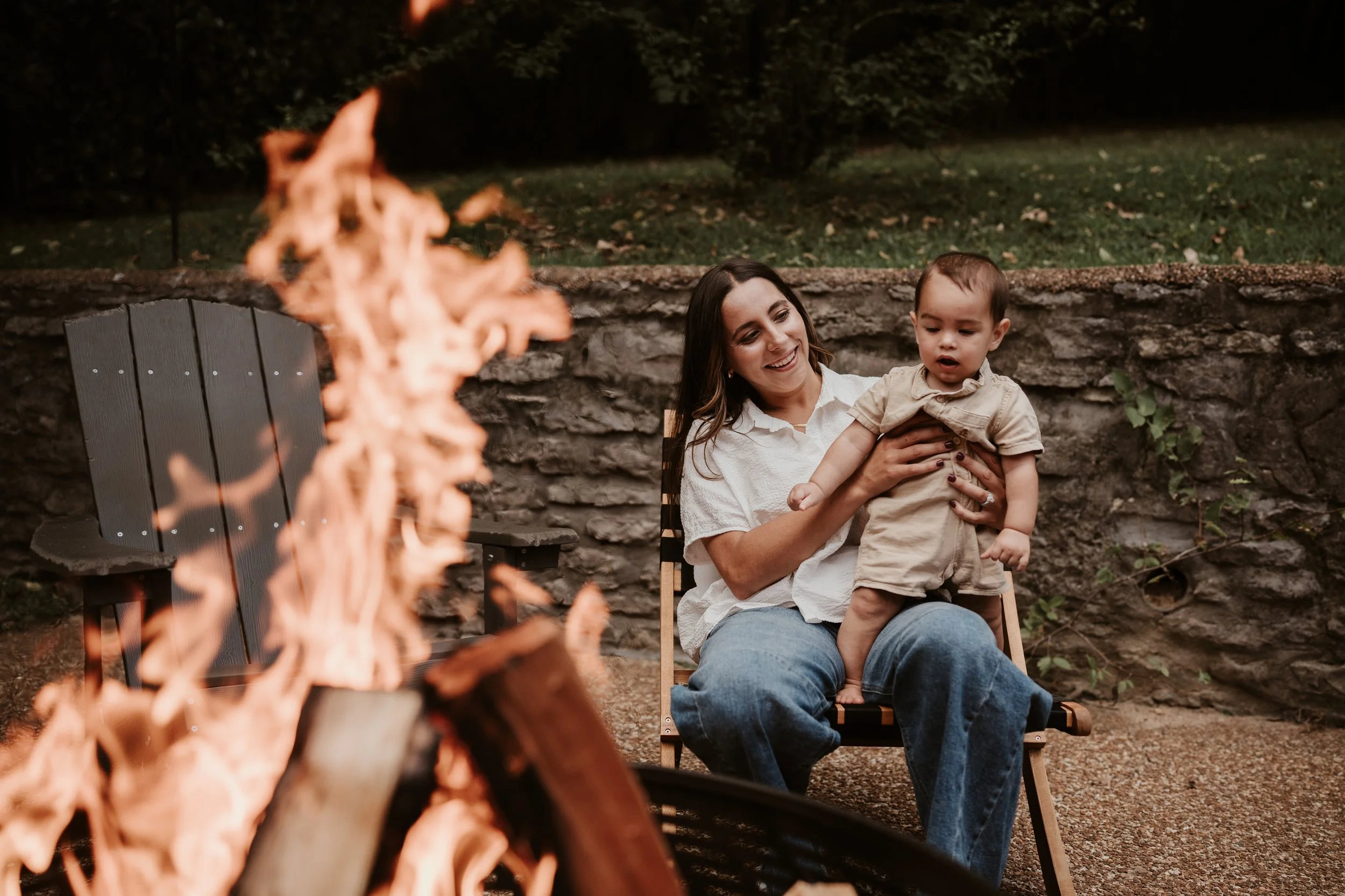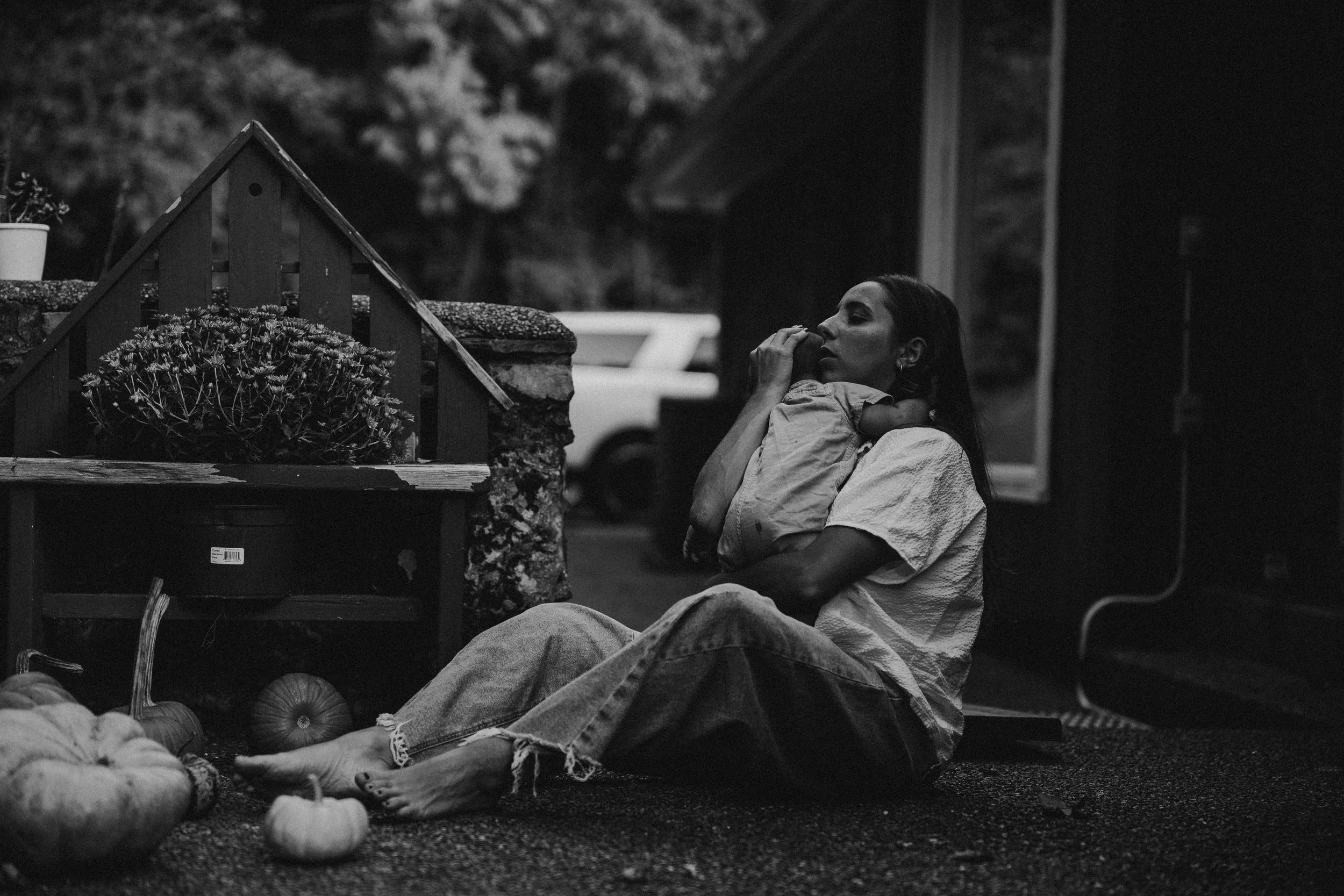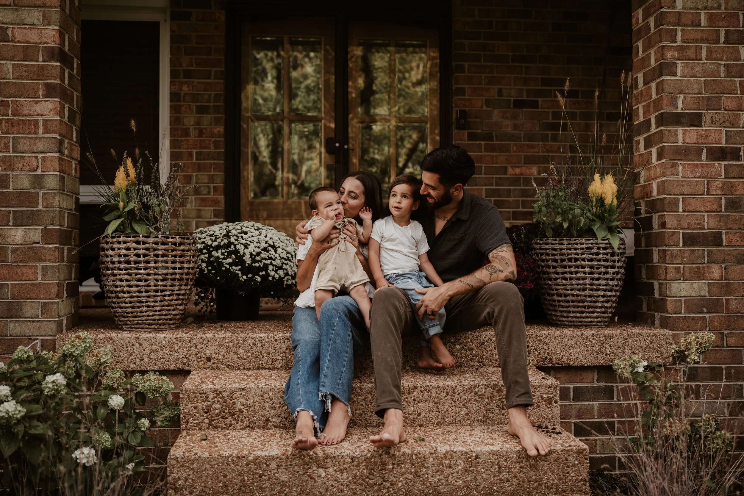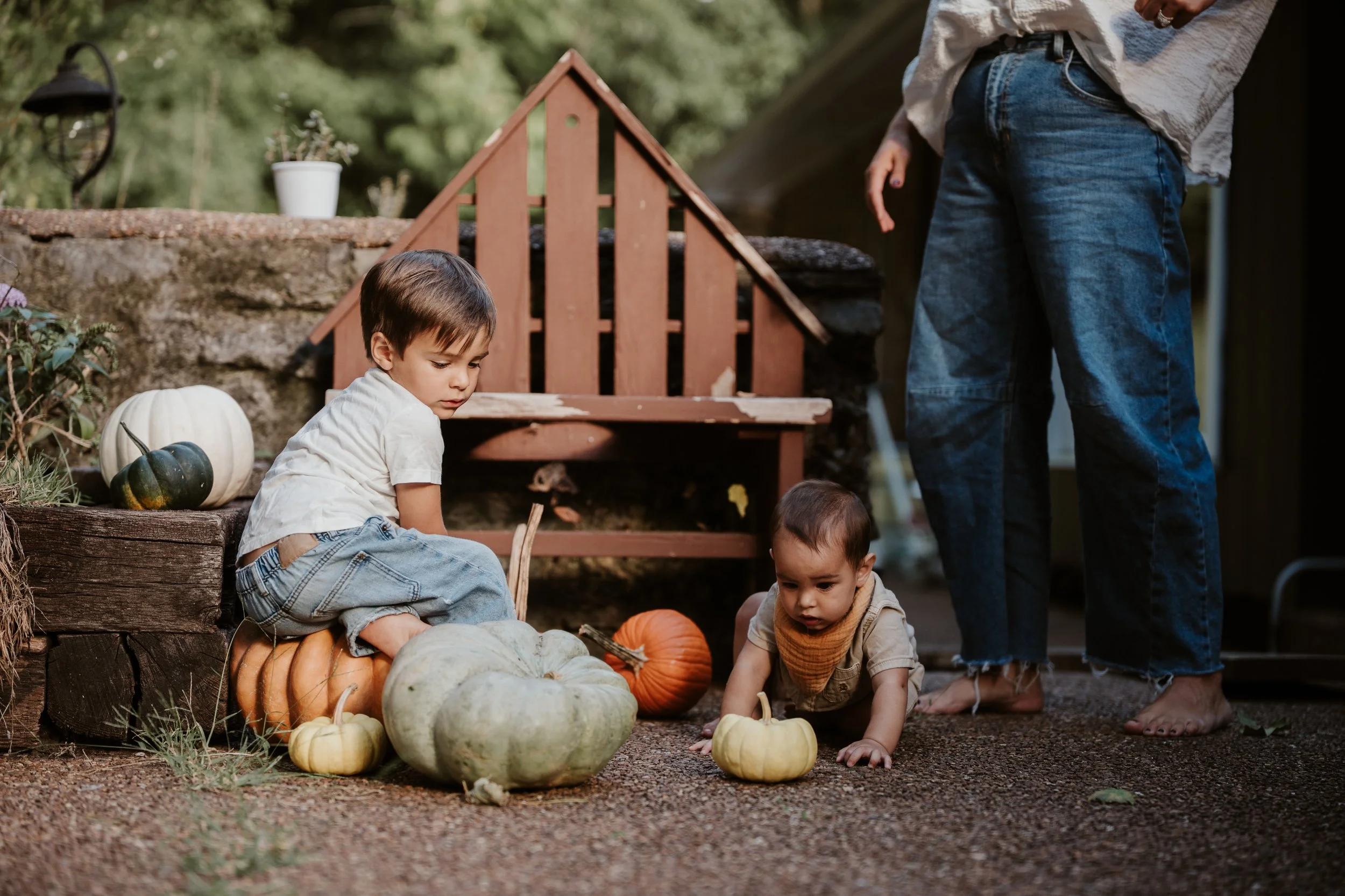 The Myers Family had their family shoot at home in October. The leaves had just begun to change and the temperatures were a touch cooler. They had mums and pumpkins to decorate their front and back yards with and so that was a huge part of their photo shoot. They also love Fall bonfires. This was the absolute perfect fall family shoot! It captured their real life of juggling two boys while doing home projects on the weekends. Letting the older son help. Taking breaks to nurse… all part of their typical days in this season.